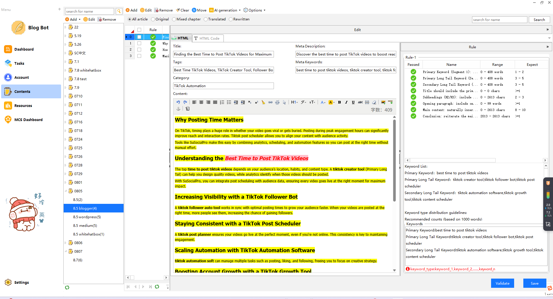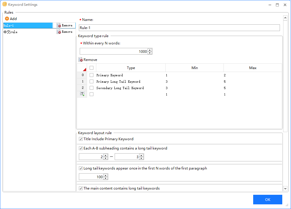 - Set Keyword Rules — Choose where keywords appear, how many times, and which words are not allowed.