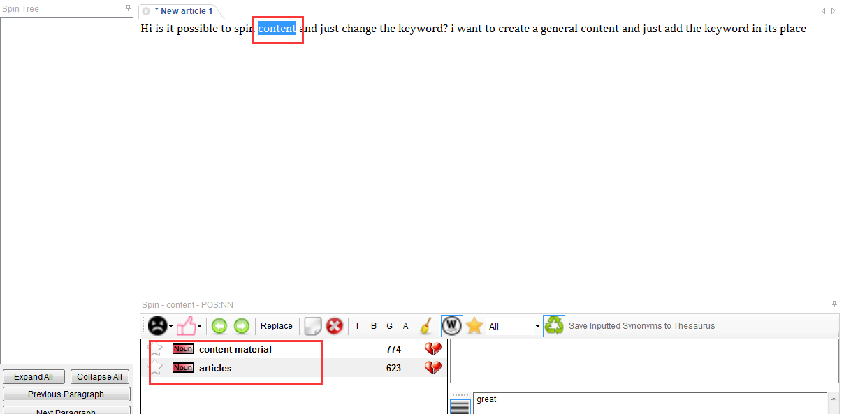 Hi, if you just need to spin one word, then you can select this word first, and then choose the synonyms you want on the bottom of this window. Check the below screenshot: