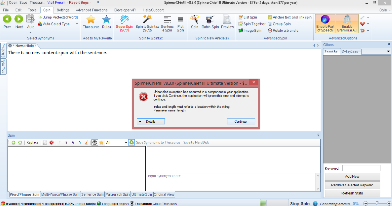 3.) While I understand that with larger articles and using the AI feature (I did note that again AI was a web-based additional paying option) the system bogs or does not load. When it does load and I submit the article into the unique "Super-Spin" the article spits out relatively the exact same content for the most part.